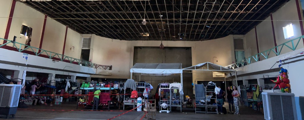 After two and half hours of beading and visiting, Hugo and I drove to a smaller shelter, Refugio Del Migrante. In 2021, the roof of this 40-room cinder block building caught on fire. No one was hurt, but migrants were displaced, and several lost their documents in the fire. Repairs were made, and migrants have returned, but the building is fire-scarred and still in need of some repairs. Two long courtyards separate the rows of the small rooms. This looked like a perfect location for installing misters. The migrants were thankful and surprised as we handed them several kits. They promised to send photos when they have the misters installed. It was 103 degrees that day. Hotter days are yet to come.