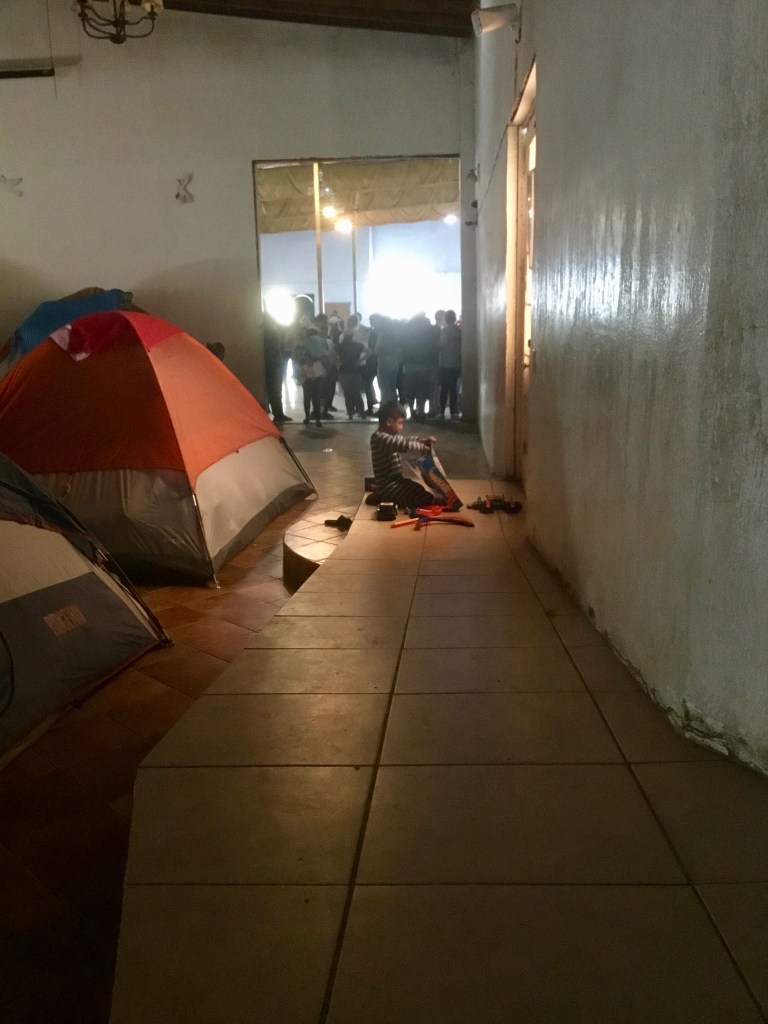 As I came back out toward the center of the tent-filled area which is in the back section of the huge cinder block building, Marisela was talking to a woman about her journey from Central America. Sue and Kate joined us and we all sat down on a step while Marisela translated while the woman told her story. We all heard firsthand about what it was like for her and her 13-year-old daughter to end up in a detention center in the United States. She said it was very cold all of the time. Her daughter was separated from her. Not only did her captors take away everyone’s shoelaces, they were also not allowed to have long sleeves in case they might use them to harm themselves. They actually had their sleeves cut from their shirts. This, of course, made the ability to stay warm even more difficult. She said the aluminum blankets were not helpful, and that she was glad to be out of that situation. She feels that the shelter they are in now has lots of rules, but she would rather be there and follow all the rules than be in the US detention center.