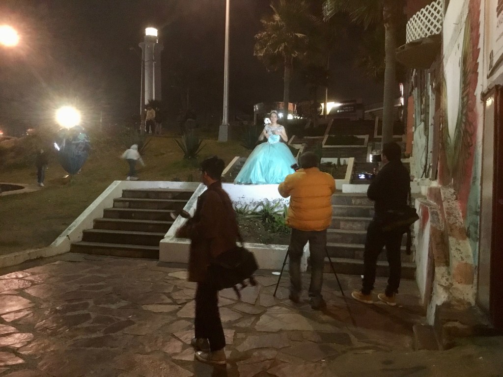 Our last stop for the day was at the one shelter run by Border Angels where the wall ends up at the ocean (commonly referred to as the corner of Latin America.) Unfortunately, we took a wrong turn trying to get there and ended up stuck in a double round-about where the cars sat motionless, with the exception of one or two at a time inching forward. We crept our way through the figure eight cluster of cars for at least a half an hour, then got back on the road along the border wall to the beach. We missed hearing the final wrap up with the others in the caravan. Just as we got there, the large group was leaving to go to a taco place which had the capacity to serve many people. Our group decided to stay at the beach. We chose a small place a few doors down from the border wall, and ate delicious fish tacos. Afterwards, we walked around the area where many people were enjoying a comfortable Saturday evening. As the sun was setting, Mexican music filled the air. We watched as a family set up lights and cameras to photograph their daughter all dressed up and posing in her “Quinceañera” gown. When a girl turns 15, she is celebrated for her passage from girlhood into womanhood.