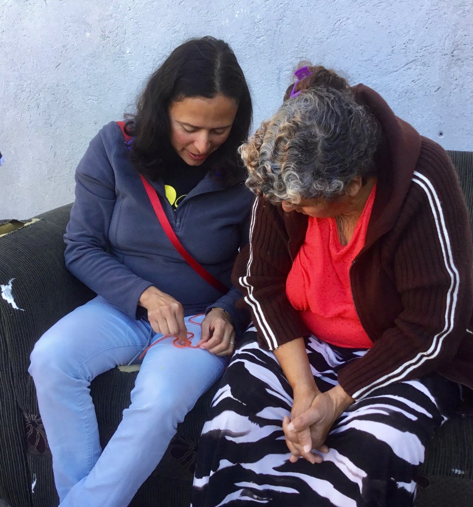 Inside Roca de Salvación, there was a sunny, colorfully-painted courtyard with long tables where we set up to work with everyone. We were all out of beads, so we set up knitting at one end, and watercolors at the other end. In no time at all, the tables were full with both children and adults. While Marisela translated for the knitters, and Ruben translated for the painters, about twenty-five people of all ages were engaging in creativity.