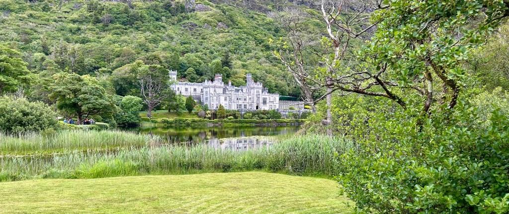 Our first stop was Kylemore Abbey, built in 1868 for a family from England. In 1920, it was bought by Benedictine nuns and became an abbey. The building was closed for tours because of restoration work, but the grounds were available for walking around. When we got off the bus, I told the driver I was a painter and was hoping to get some good photos of the landscape, but said it was challenging from a side window. He immediately offered the front seat on the bus next to him. There was a fold-down seat normally used for a tour guide. I was thrilled and very thankful for the opportunity.