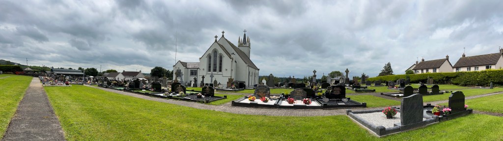 Back on the road, I decided to bypass Belfast on the way north to avoid traffic and the hassle of city driving. Wandering through beautiful countryside, I arrived at Loughgiel around noon. It is barely a town, but, yes, there is a church and a pub. I pulled up next to the graveyard surrounding the back of the church. I thought I might see if they were any grave markers with the McGarry name. I stepped through the gate and was shocked to see the third stone read “McGarry.” I had found it so quickly! Then there was another right next to it, and another behind it. As I walked through the graveyard, there were more McGarrys than any other name. I was perplexed since written family history says my great grandfather’s family had moved to Ballycastle sometime after he was born. I photographed every McGarry tombstone.