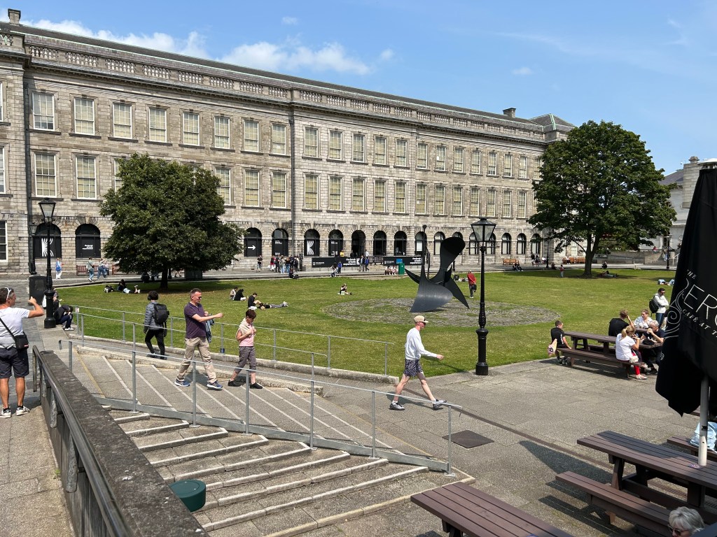 I left Belfast and drove back to Dublin. My sister Mary Pat and her husband Matt had landed in Dublin the night before. We wanted to meet up once they caught up from their jetlag. I found my next place to stay only two blocks from their hotel. After a short rest, I went to check out Trinity College. I caught the bus, and when I got off, I was on a bustling sidewalk on a sunny day in Dublin with people and pubs and sidewalk cafes. I walked toward campus and through a dark hallway into an impressive courtyard. It was nice to finally see Trinity’s campus.