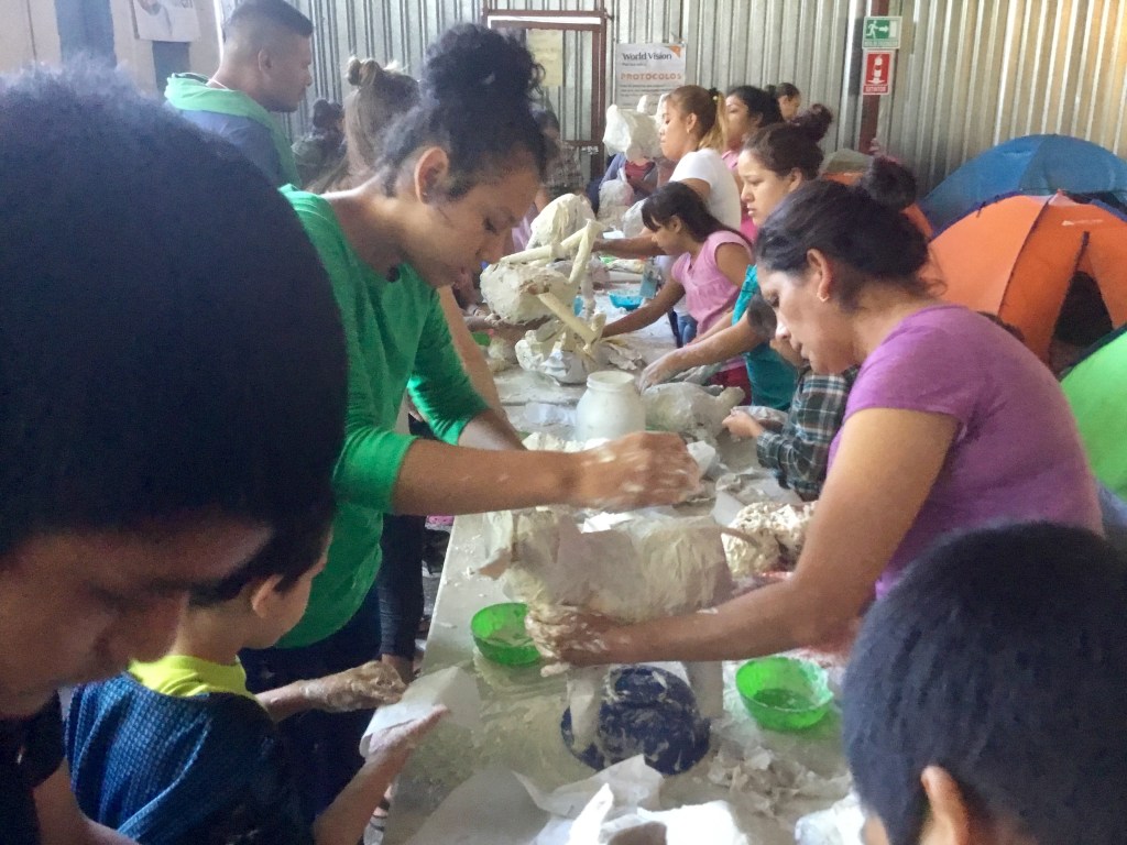 We then returned to the Movimiento Juventud shelter to continue our project. It was almost two o’clock. The adults asked if they could help with this part, and we were glad they wanted to participate. They set up tables in a long row in the main room in front of all the tents. Hayley explained the next steps while I filled bowls with flour to make paste. In no time at all, almost everyone in the shelter was mixing flour-and-water, tearing up paper, dipping the pieces into the “goop,” and smoothing it onto the stuffed paper animal shapes.