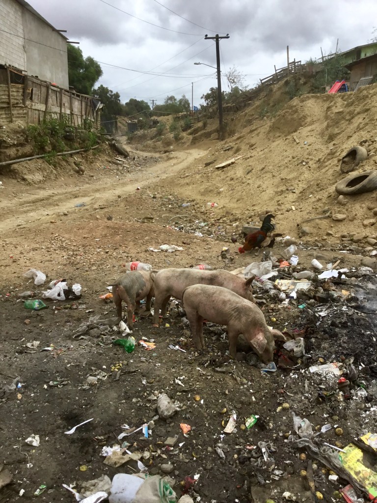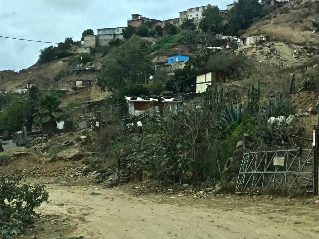 The next shelter we visited was Embajadores de Jesús, hidden deep inside Scorpion Canyon. The route gave us a glimpse into the extreme poverty in this densely populated border city of two million. We found the church after a long and complicated drive among the steep cliffs and gorges of a rugged, non-tourist part of Tijuana. As we wound our way through narrow roads lined with endless dilapidated houses and shacks, we saw hillsides and shanties held up by stacked, half-buried tires. The dwellings and road conditions worsened the further in we drove.
