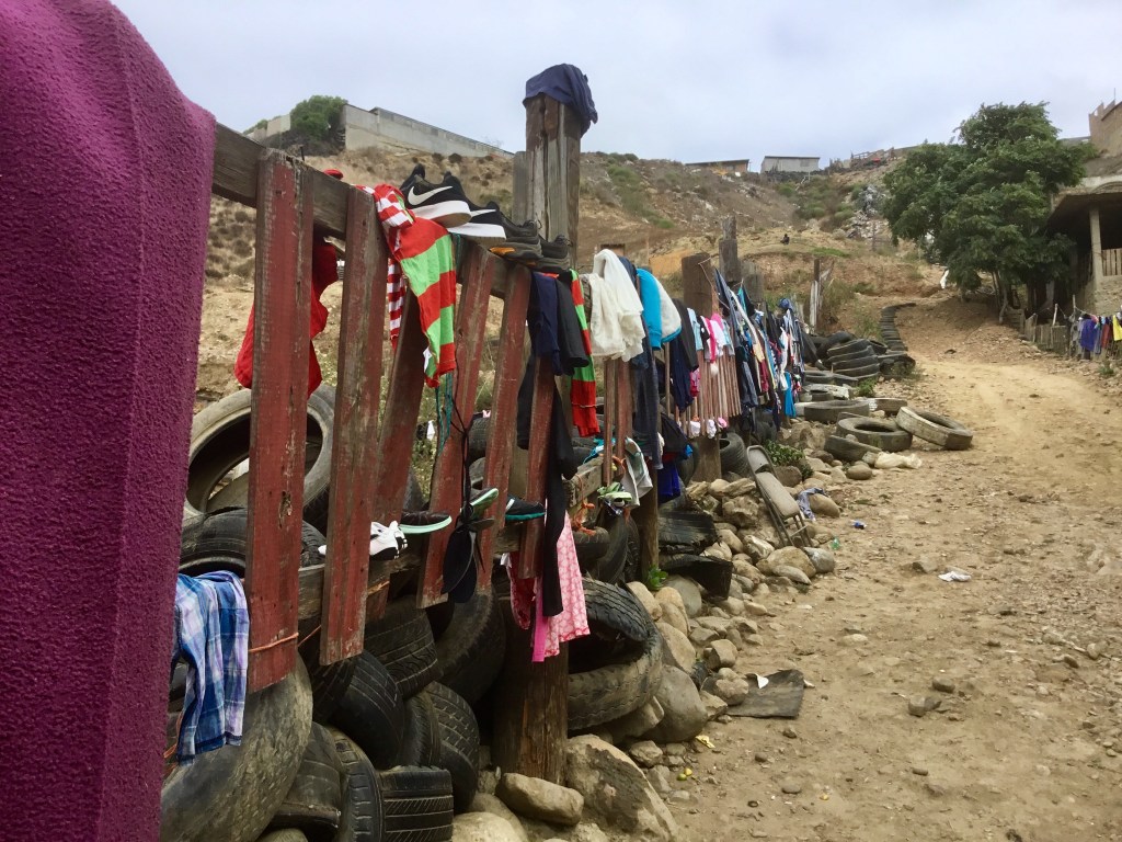 Outside, a fence that travelled up the hillside, served as a clothesline, strewn with recently washed shirts, pants, and tennis shoes, all drying in the sun. Old tires were scattered like rocks, or sometimes used for support to hold a post in place.